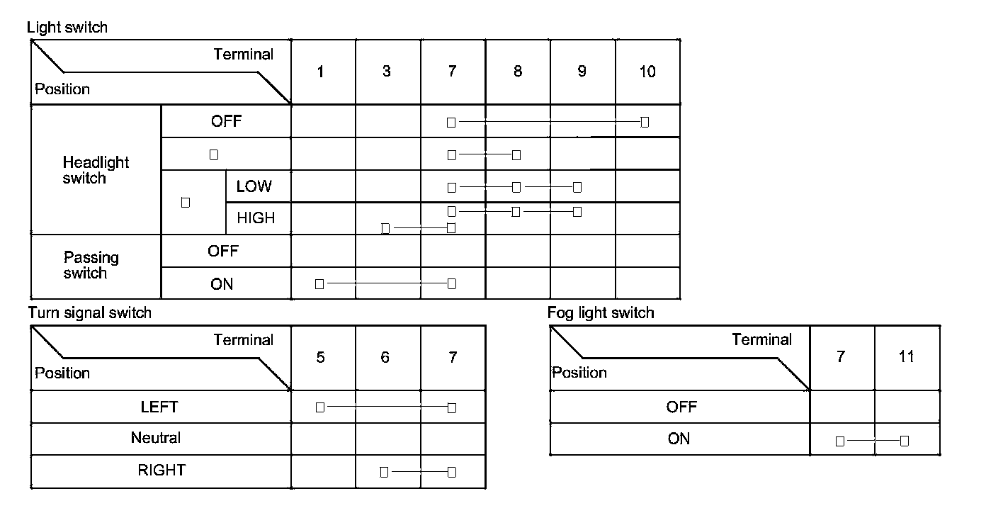 5. Check for continuity between the terminals in each switch position according to the tables.