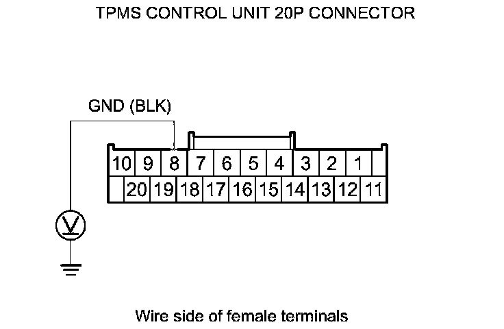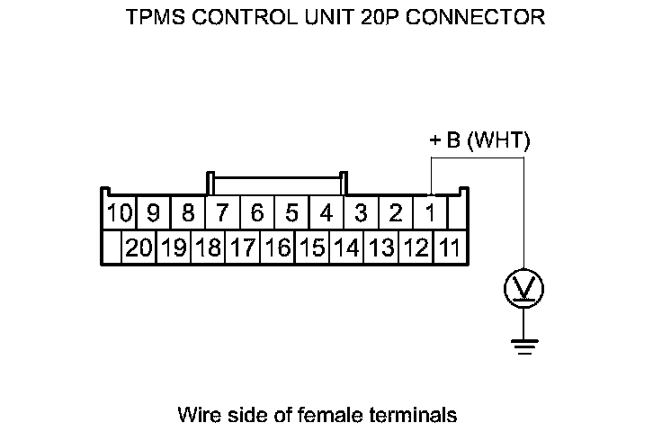 8. Measure the voltage between body ground and TPMS control unit 20P connector terminal No. 1.