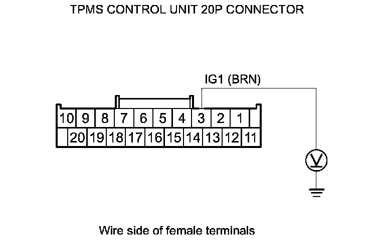 10. Measure the voltage between body ground and TPMS control unit 20P connector terminal No. 3.