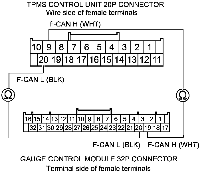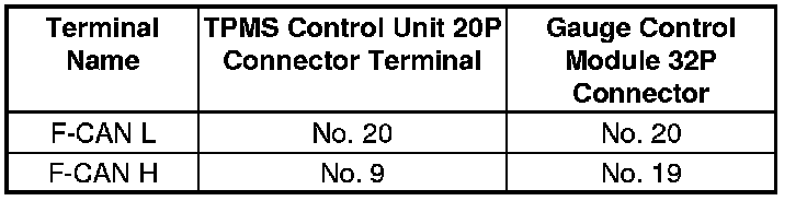 18. Check for continuity between the TPMS control unit 20P connector terminals and the gauge control module 32P connector terminals according to the table.