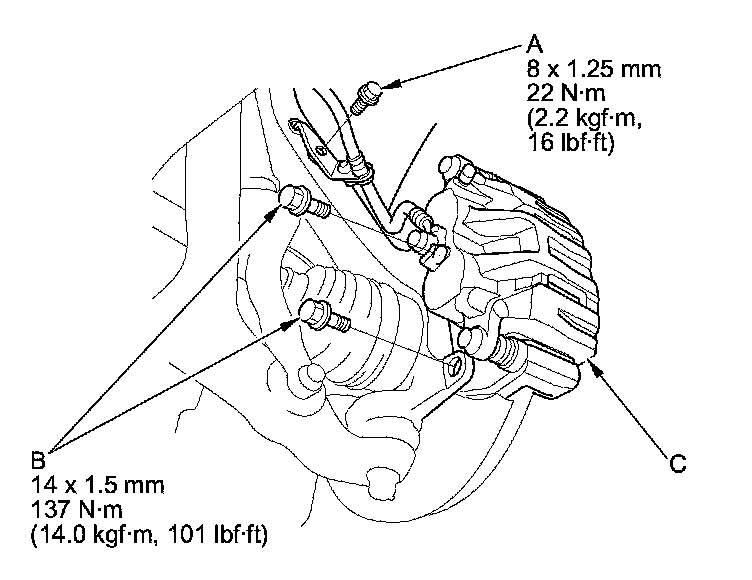 4. Remove the brake caliper bracket mounting bolts (B), then remove the caliper assembly (C) from the knuckle. To prevent damage to the caliper assembly or the brake hose, use a short piece of wire to hang the caliper assembly from the undercarriage. Do not twist the brake hose excessively.