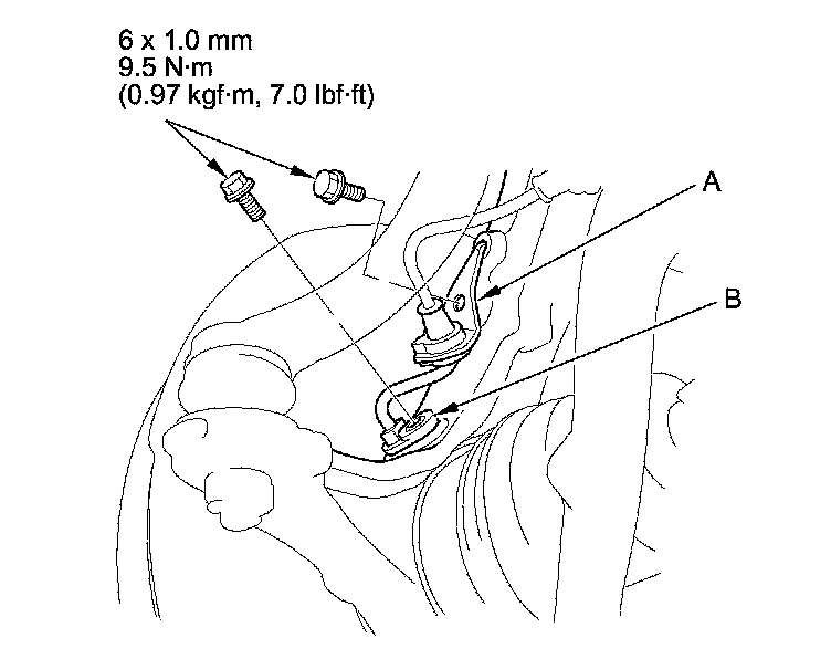 5. Remove the wheel speed sensor harness bracket (A) and the wheel speed sensor (B) from the knuckle. Do not disconnect the wheel speed sensor connector.