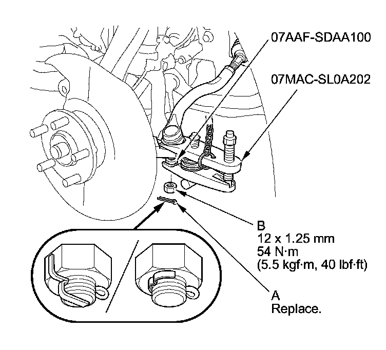 11. Remove the cotter pin (A) from the knuckle ball joint, then remove the castle nut (B).