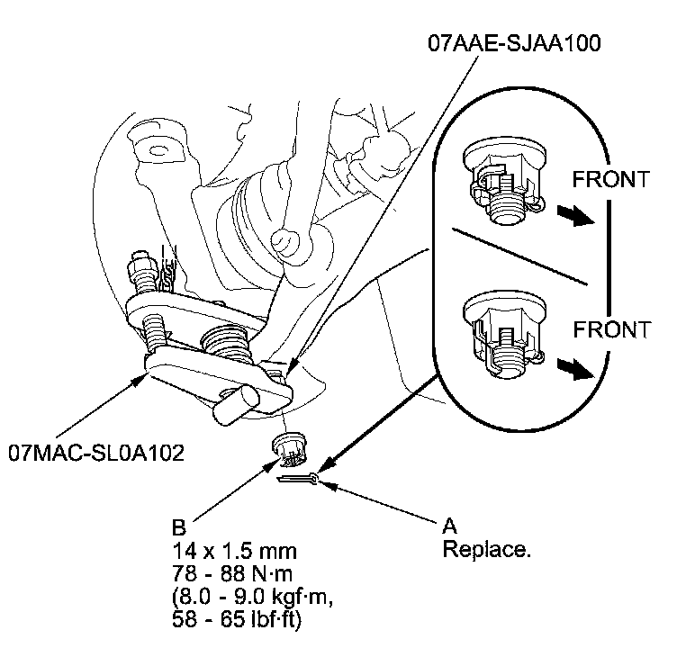 NOTE: During installation, insert the new cotter pin into the ball joint pin hole from the front to the rear of the vehicle, and bend its end as shown. Check the ball joint pin hole direction before connecting the ball joint.