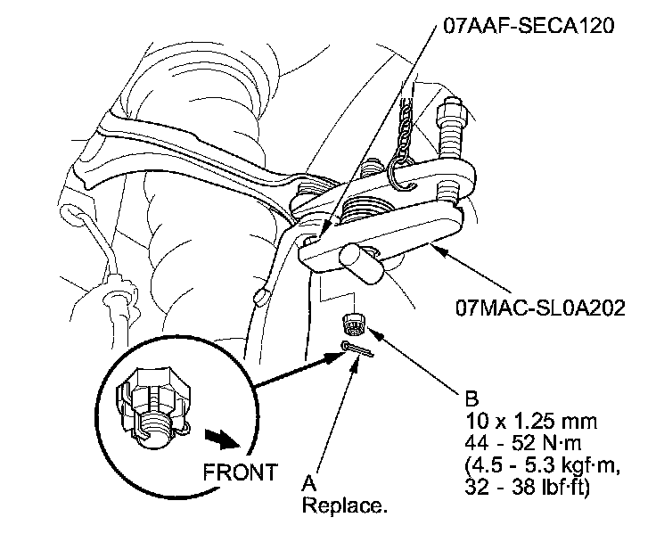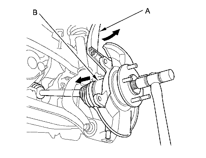 15. Pull the knuckle (A) outward, and separate the outboard joint (B) from the front hub using a soft face hammer outward, then remove the knuckle/hub.