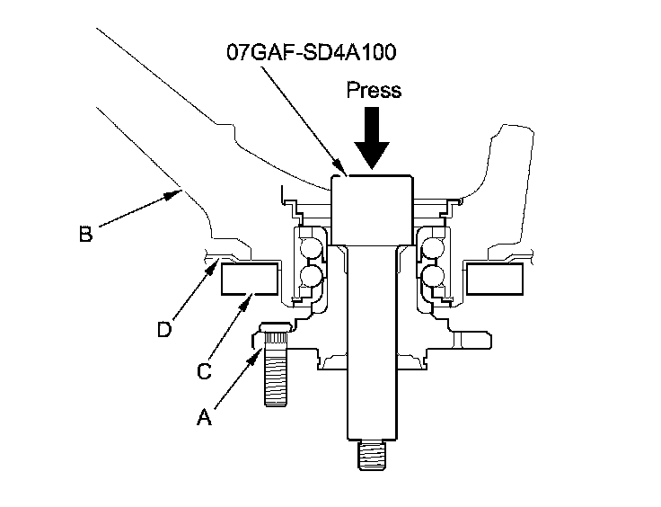 7. Press a new wheel bearing (A) into the knuckle (B) using the old bearing (C), a steel plate (D), the attachment, the support base, and a press.