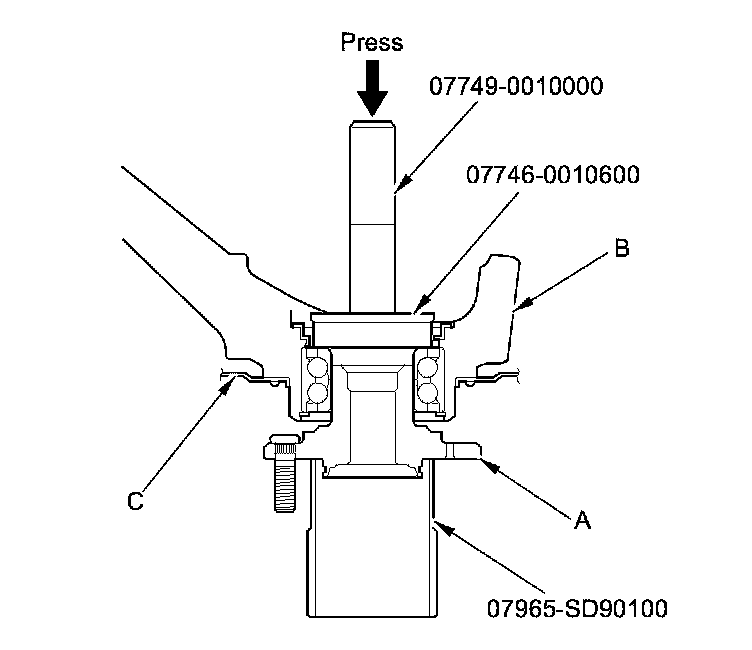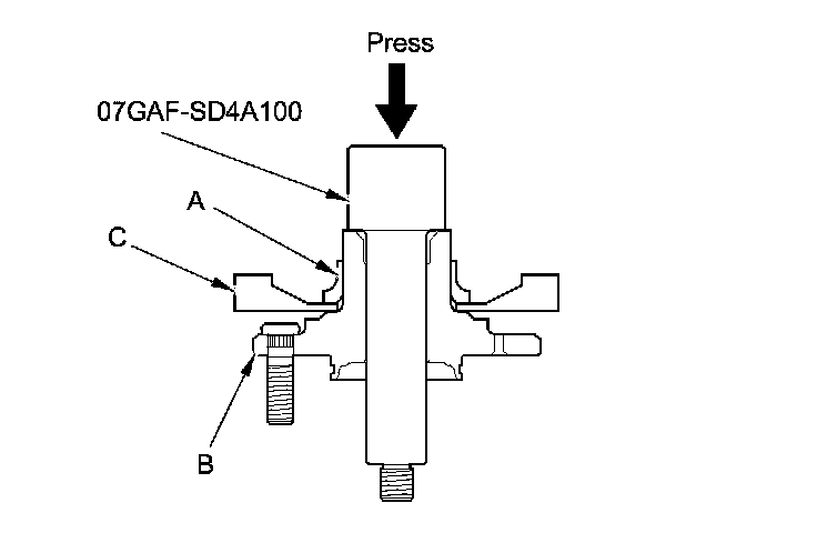 11. Install the hub (A) onto the knuckle (B) using the attachment, the driver handle, the support base, and a hydraulic press. Be careful not to damage the splash guard (C).