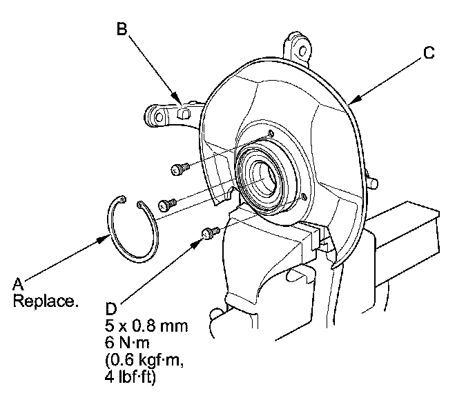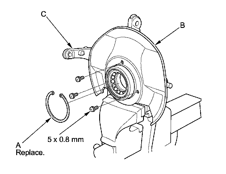 4. Remove the snap ring (A) and the splash guard (B) from the knuckle (C).