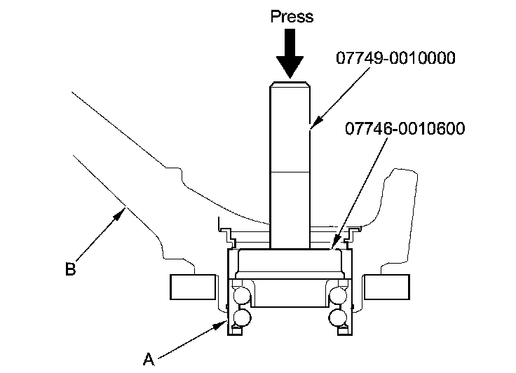 5. Press the wheel bearing (A) out of the knuckle (B) using the attachment, the driver handle, and a press.