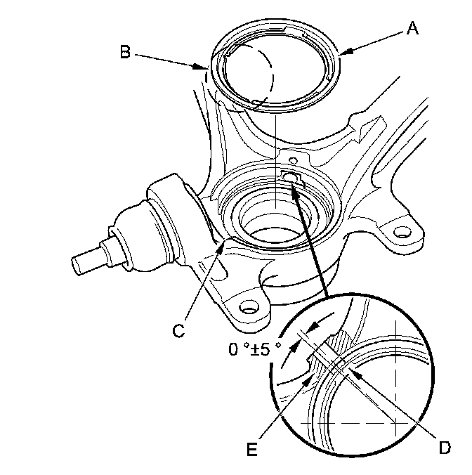 NOTE: When installing the new front knuckle ring, position the knuckle ring notch portion (B) toward cut out (C) near the ball joint in the knuckle, and align the center of the knuckle ring ledge portion (D) with the center of the wheel speed sensor hole (E) on the knuckle as shown.