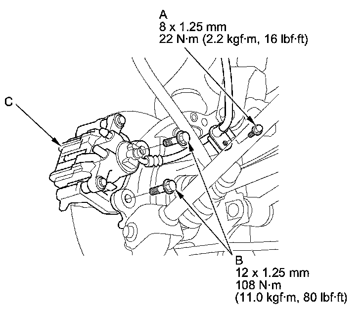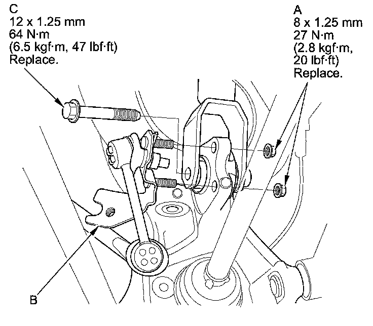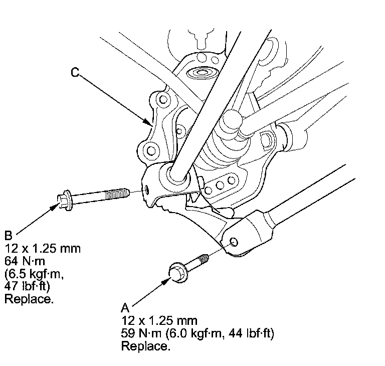 11. Remove the lower arm A mounting bolt (A), and the lower arm B mounting bolt (B), then remove the knuckle (C).