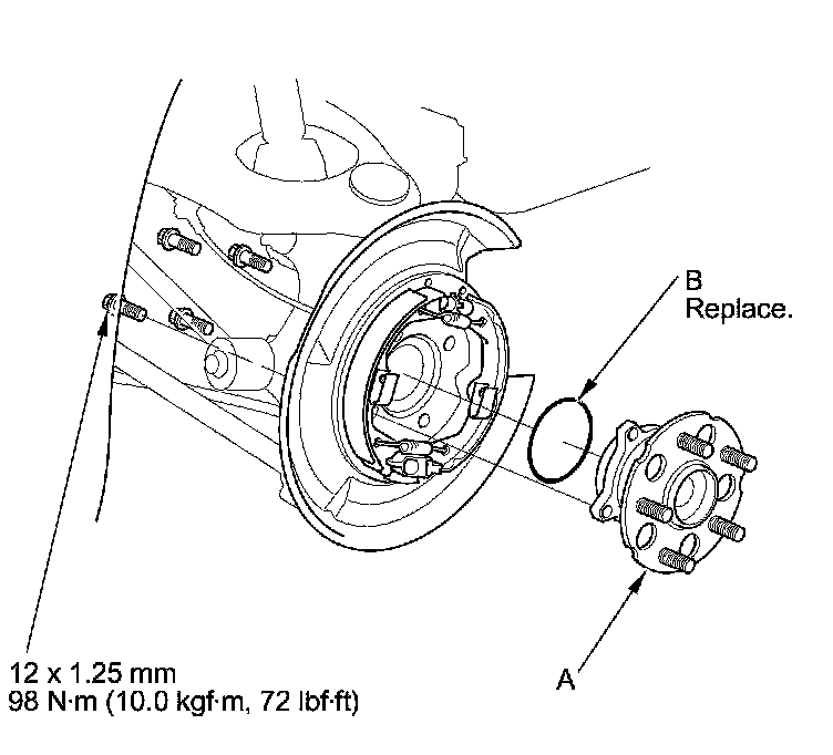 12. Install the hub bearing unit in the reverse order of removal, and note these items: