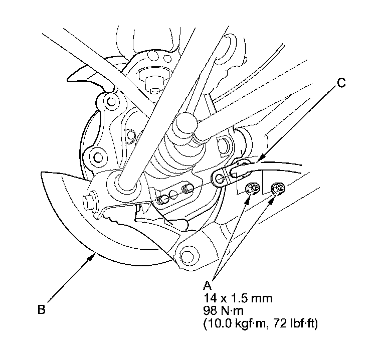 5. Remove the brake caliper bracket mounting bolts (B), then remove the caliper assembly (C) from the knuckle. To prevent damage to the caliper assembly or the brake hose, use a short piece of wire to hang the caliper assembly from the undercarriage. Do not twist the brake hose excessively.