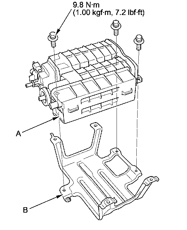 8. Remove the EVAP canister (A) from the EVAP canister bracket (B).
