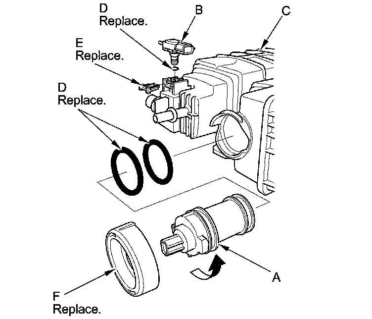 10. Reassemble the EVAP canister with new O-rings (D), a new retainer (E), and a new cap (F), then install the EVAP canister bracket.