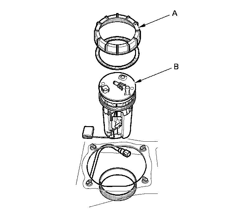 7. Remove the locknut (A) and the fuel tank unit (B).