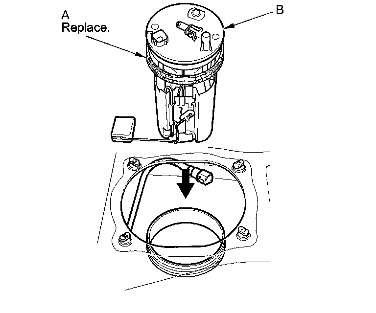 1. Temporarily attach a new base gasket (A) to the fuel tank unit (B), then insert the fuel tank unit partially into the fuel tank.