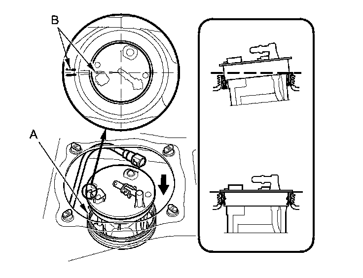 3. Align the marks (B) on the fuel tank and fuel tank unit, then insert the fuel tank unit into the fuel tank until the fuel tank unit rests on top of the base gasket.