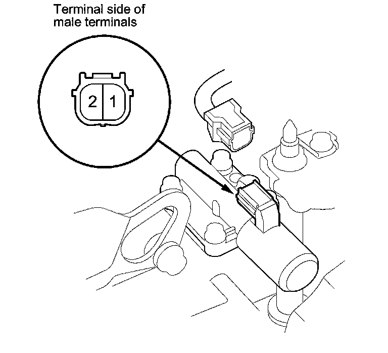 12. Connect a jumper wire from the negative battery terminal to A/T clutch pressure control solenoid valve C connector terminal No. 1, and connect another jumper wire from the positive battery terminal to connector terminal No. 2. Make sure A/T clutch pressure control solenoid valve C moves.