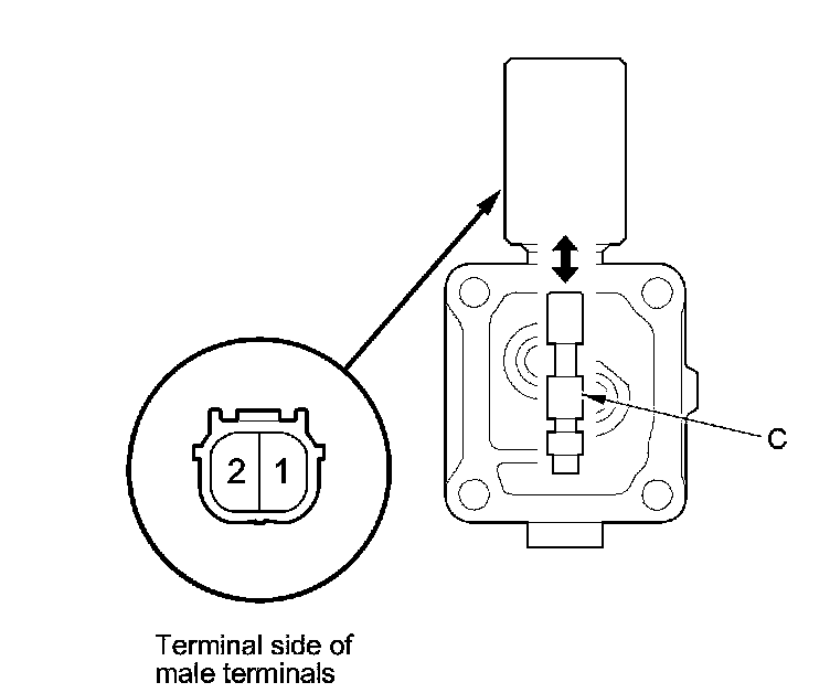 13. Disconnect one of the jumper wires, and check the valve movement (C) at the fluid passage. If the valve binds or moves sluggishly, or if the valve does not operate, replace A/T clutch pressure control solenoid valve C.