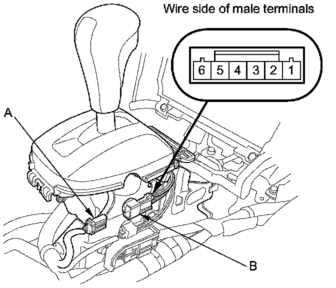 2. Disconnect the park pin switch/A/T gear position indicator panel light 6P connector (A) from the park pin switch (B).