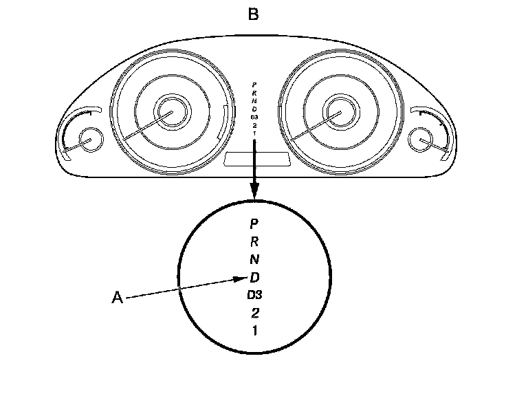 When the powertrain control module (PCM) senses an abnormality in the input or output system, the D indicator (A) in the gauge control module (B) will usually blink.