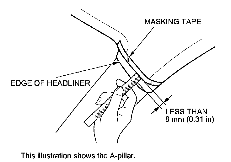 To prevent the side curtain airbag from deploying and damaging the pillar trim (A-pillar trim, B-pillar trim, C-pillar trim), the overlap between the headliner and pillar trim must be less than 8 mm(0.31 in). To check the overlap, do this: