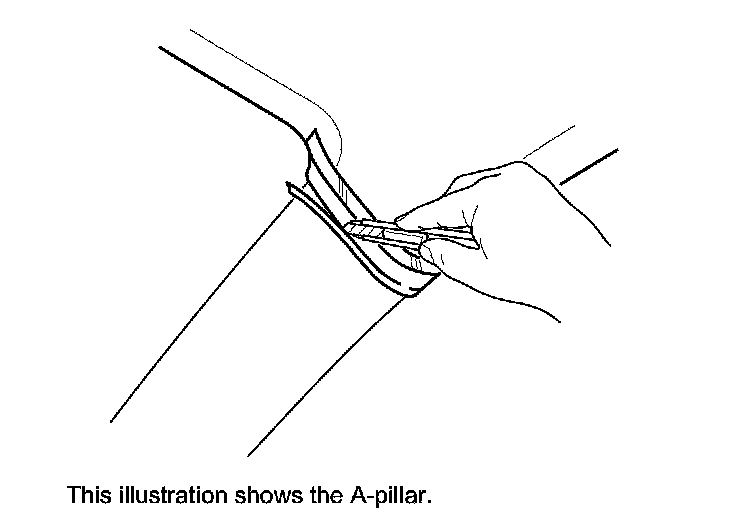 2. Apply masking tape (A) to the headliner (B) to mark the upper edge of the pillar trim (C).