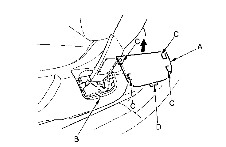 1. Slide the front seat all the way forward and lower it all the way down. Carefully pry up on the bottom of the anchor cover (A) at the pry point (B) with the appropriate trim tool to release the hooks (C) and the tab (D), then remove the cover by pulling it upward.