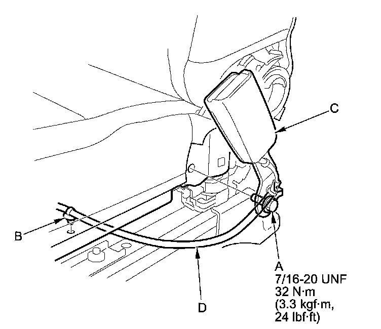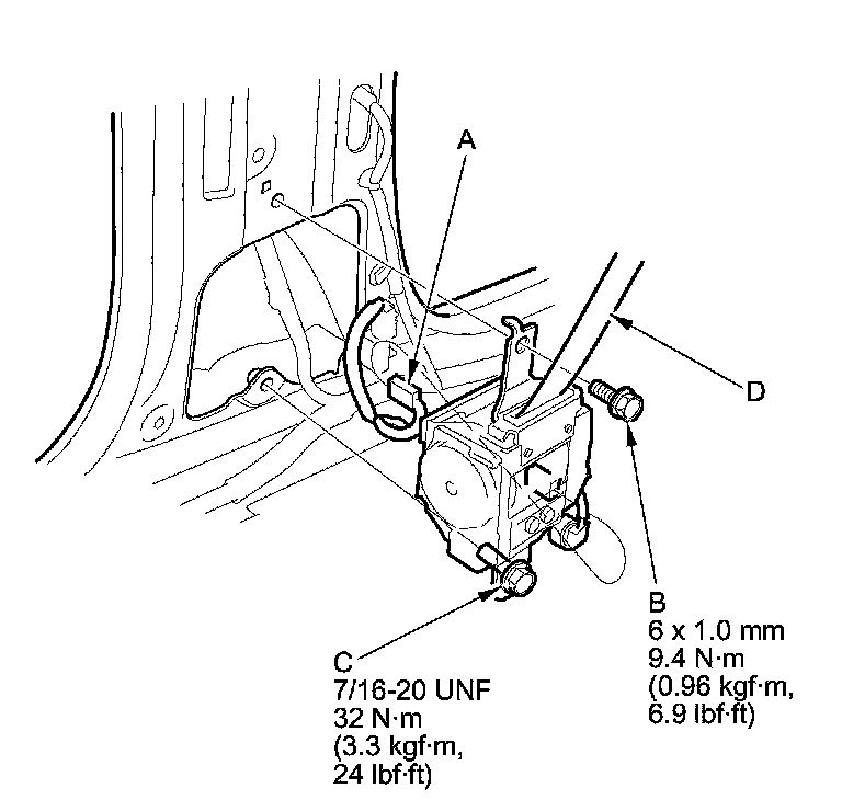 6. Disconnect the seat belt tensioner connector (A). Remove the upper retractor mounting bolt (B) and the lower retractor bolt (C), then remove the front seat belt assembly (D).