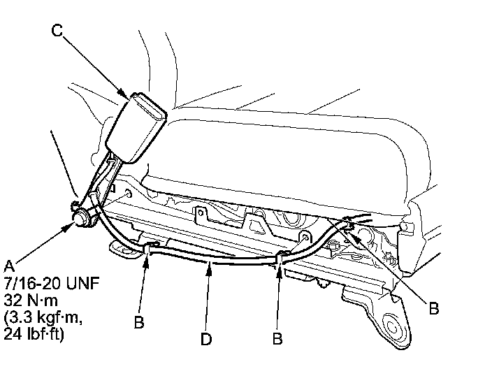 8. Install the seat belt in the reverse order of removal, and note these items: