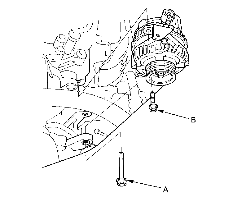 1. Install the alternator, then tighten the mounting bolt (A) and the alternator bracket mounting bolt (B).