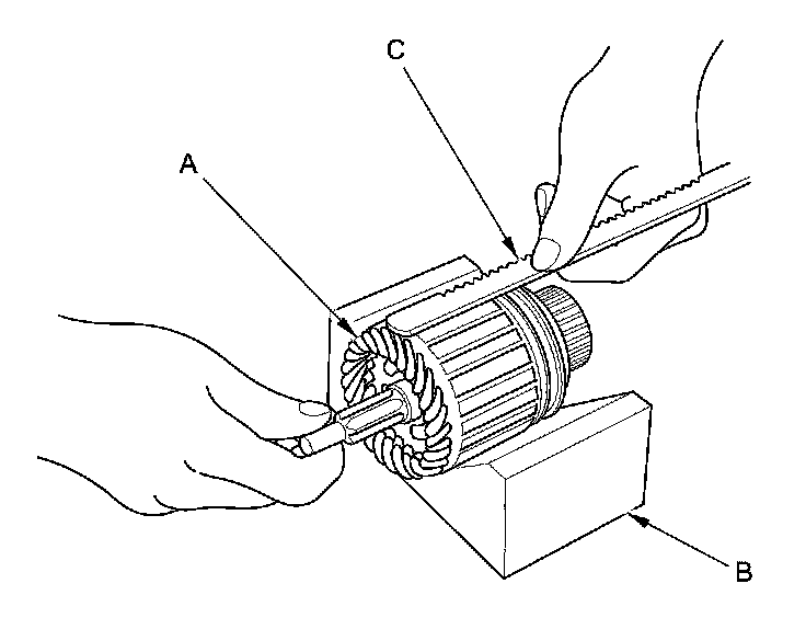 11. Place the armature (A) on an armature tester (B). Hold a hacksaw blade (C) on the armature core. If the blade is attracted to the core while the core is turned, the armature is shorted. Replace the armature.