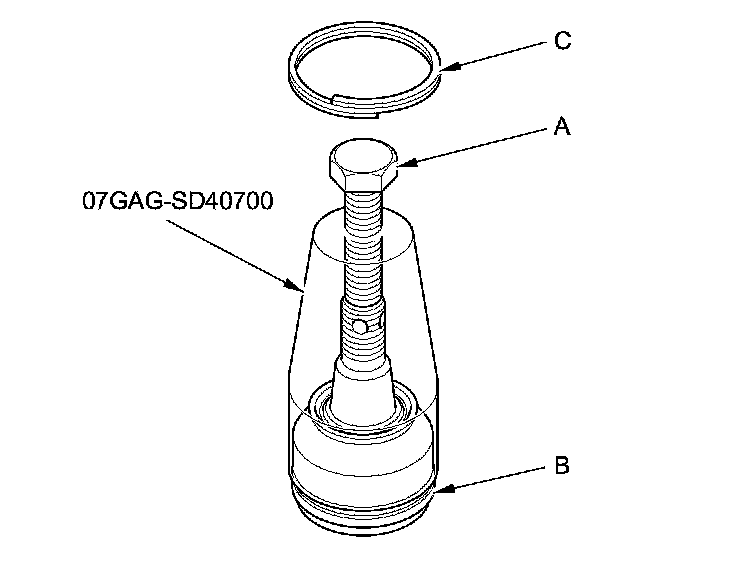 9. The front upper arm ball joint: Adjust the clip guide with the adjusting bolt (A) until its base is just above the groove around (B) the bottom of the boot. Then slide the clip (C) over the clip guide and into position on the boot.