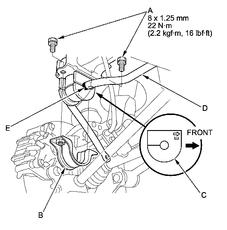 NOTE: During installation, align the paint marks (E) on the stabilizer bar with the side of the bushings.
