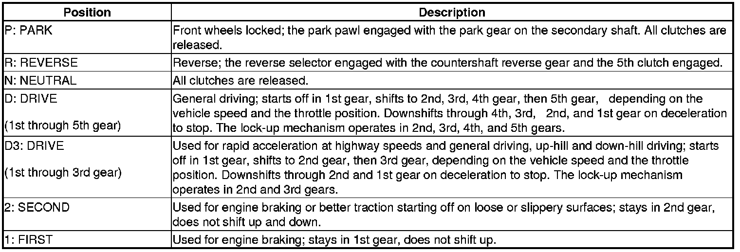 The shift lever has seven positions; P: PARK, R: REVERSE, N: NEUTRAL, D: DRIVE 1st through 5th gear, D3: DRIVE 1st through 3rd gear, 2: SECOND, and 1: FIRST.