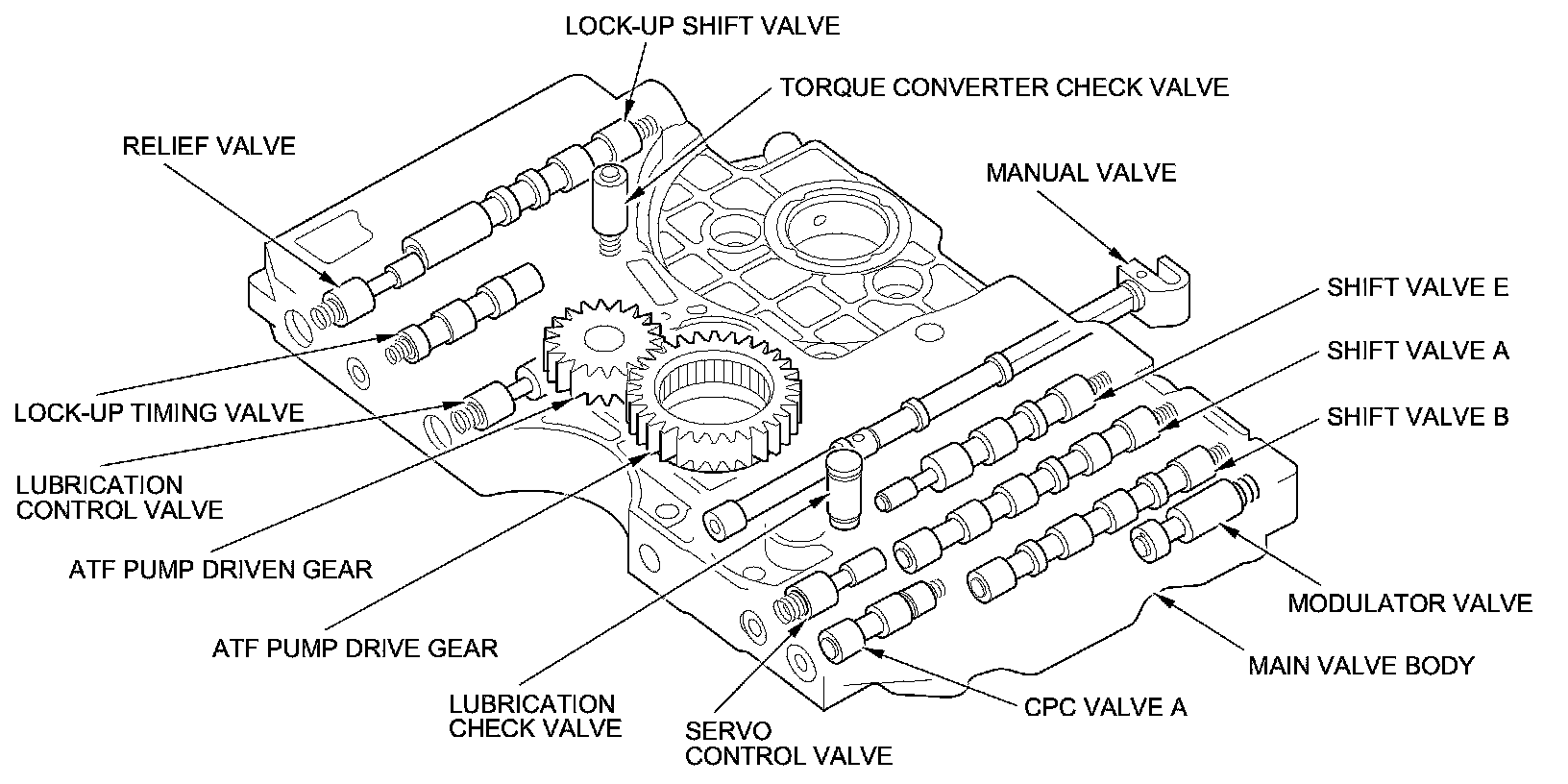 The main valve body contains the manual valve, the modulator valve, the torque converter check valve, shift valve A, shift valve B, shift valve E, CPC valve A, the servo control valve, the relief valve, the lock-up shift valve, the lock-up timing valve, the lubrication control valve, the lubrication check valve, the ATF pump drive gear, and the ATF pump driven gear. The primary function of the main valve body is to switch hydraulic pressure on and off to the hydraulic control system.