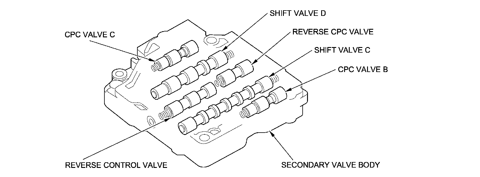 The secondary valve body is on the main valve body. The secondary valve body contain shift valve C, shift valve D, CPC valve B, CPC valve C, the reverse control valve, and the reverse CPC valve.