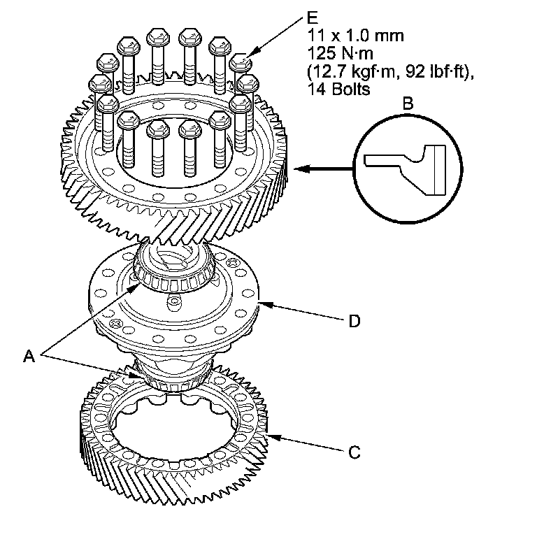 NOTE: The final driven gear bolts (E) have left-hand threads.