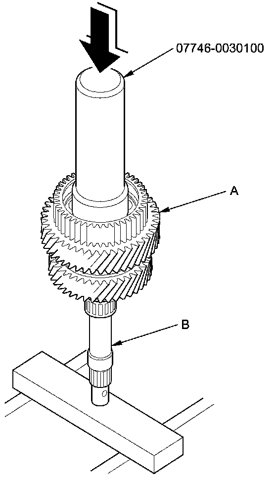 2. Slide a new mainshaft 4th gear (A) over the mainshaft (B), then press it into place using the 40 mm driver handle and a press.