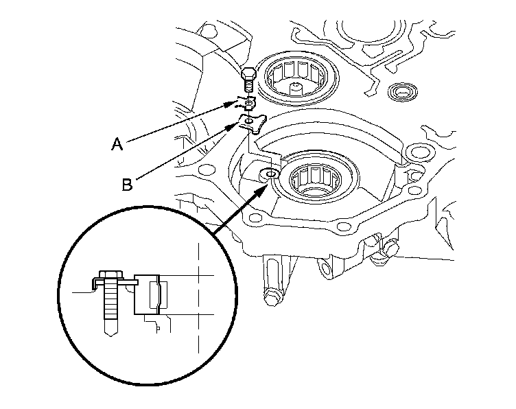 1. Remove the bolt, then remove the lock washer (A) and the bearing set plate (B).