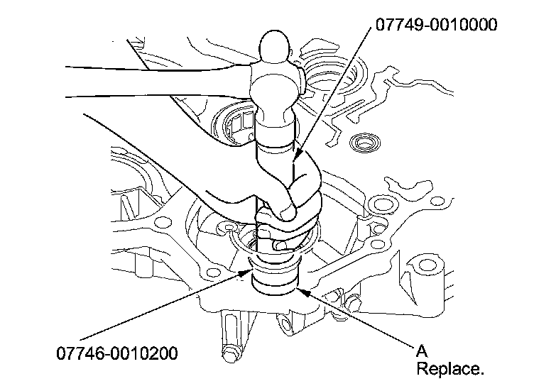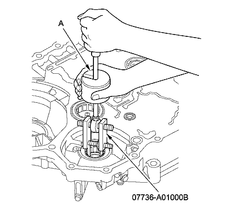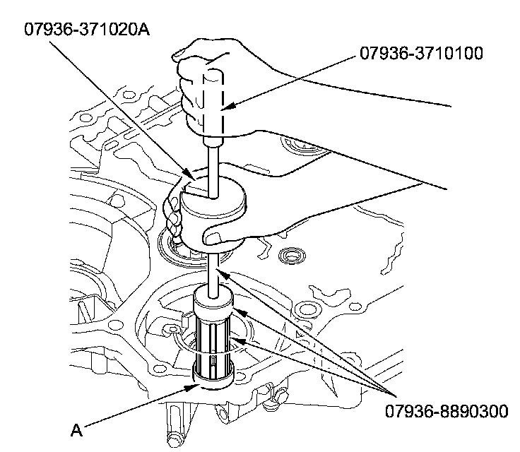 4. Remove the 29 x 39 x 9.5 mm secondary shaft bearing (A) from the torque converter housing using the 30 mm bearing remover shaft set, the remover handle, and the slide hammer.