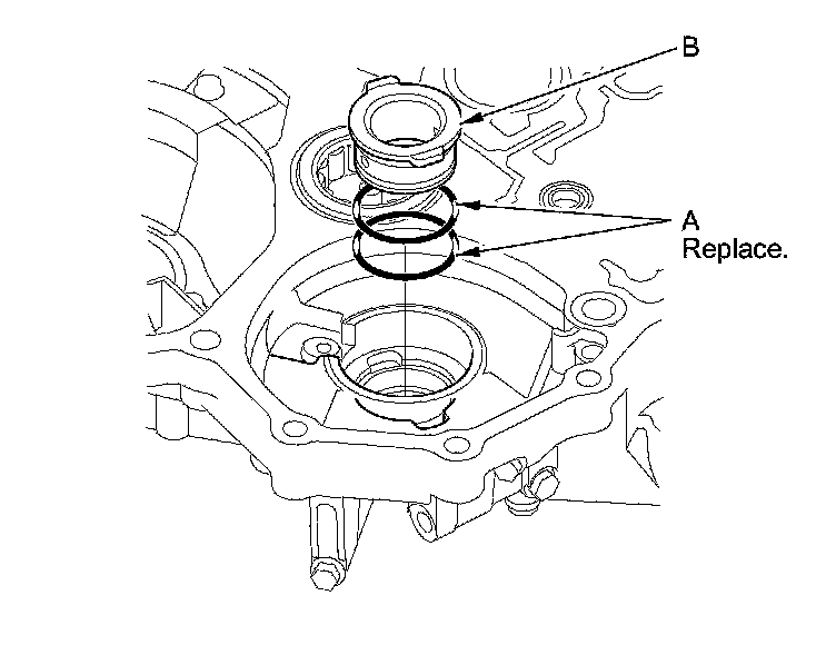 6. Install new O-rings (A) into the ATF guide collar grooves, then install the ATF guide collar (B) in the torque converter housing.
