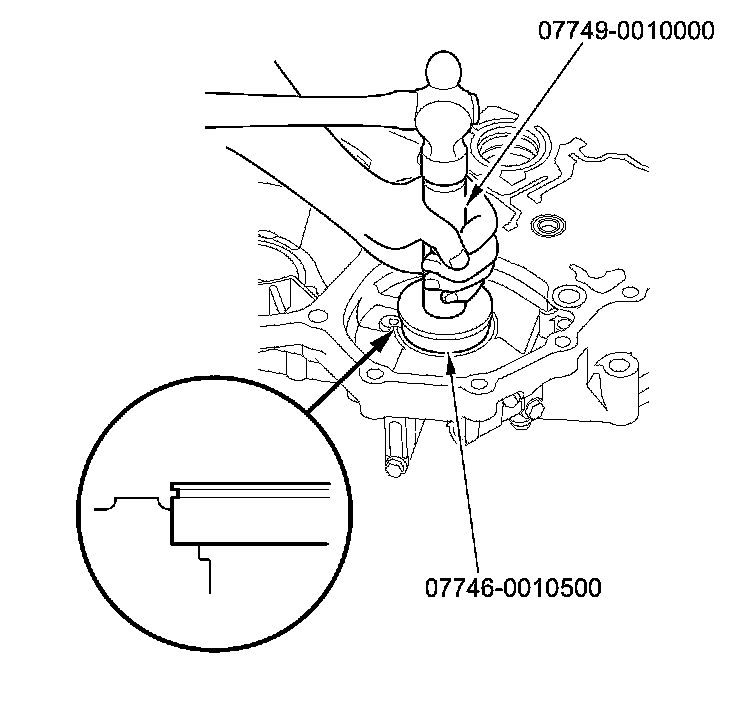 7. Install the bearing in the direction shown in the torque converter housing using the driver handle and the 62 x 68 mm bearing driver attachment.