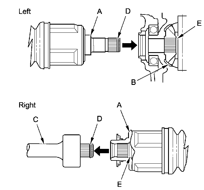 6. Insert the inboard end (A) of the driveshaft into the differential (B) or the intermediate shaft (C) until the set ring (D) locks in the groove (E).