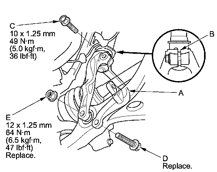 12. Loosely install a new damper fork mounting bolt (D) and a new damper fork mounting nut (E).