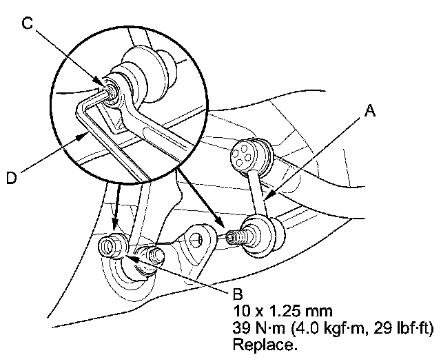 13. Connect the front stabilizer link (A) to the lower arm, and loosely install a new flange nut (B). Hold the stabilizer link joint pin (C) using a hex wrench (D), and tighten the flange nut.
