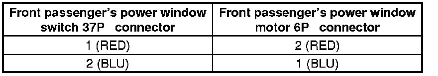 2. Test the motor in each direction by connecting battery power and ground to the front passenger's power window switch 37P connector (A) according to the table.