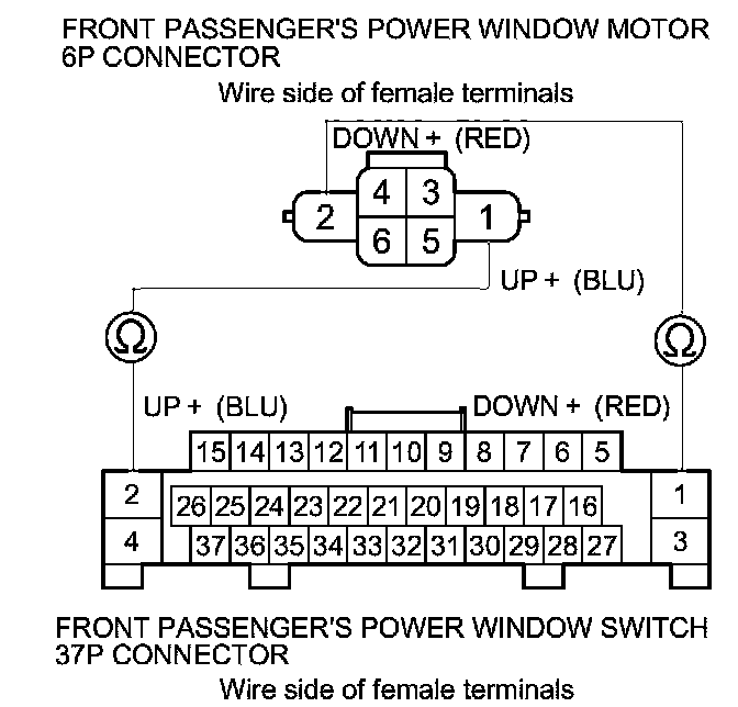 6. Check for continuity between the front passenger's power window switch 37P connector terminals and front passenger's power window motor 6P connector terminals as shown. There should be continuity.