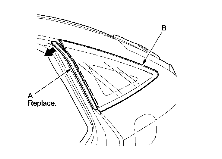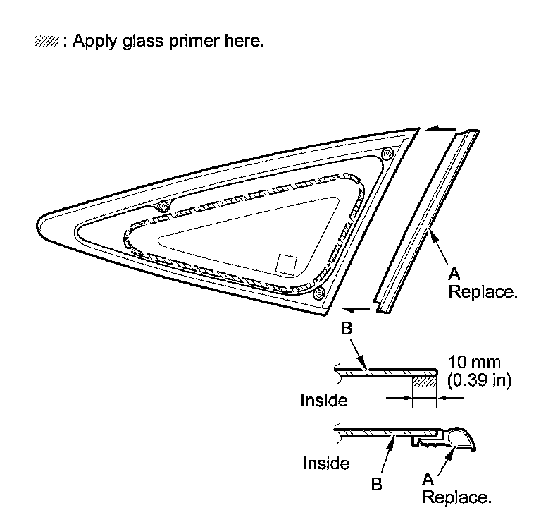 9. Attach the new front seal (A) with adhesive tape to the inside face of the quarter glass (B) as shown. Before installing the front seal, apply primer to the inside face of the quarter glass.